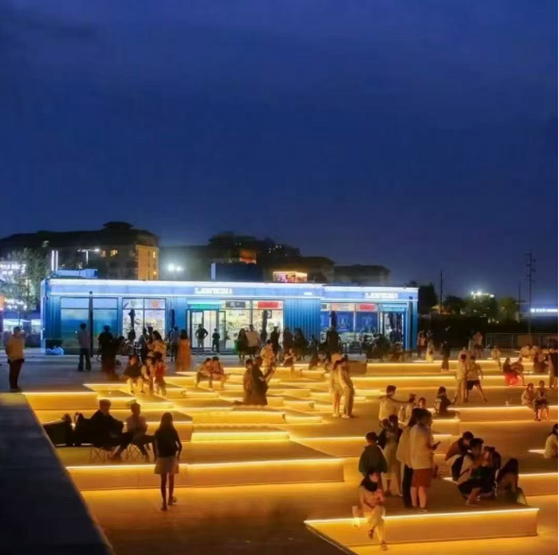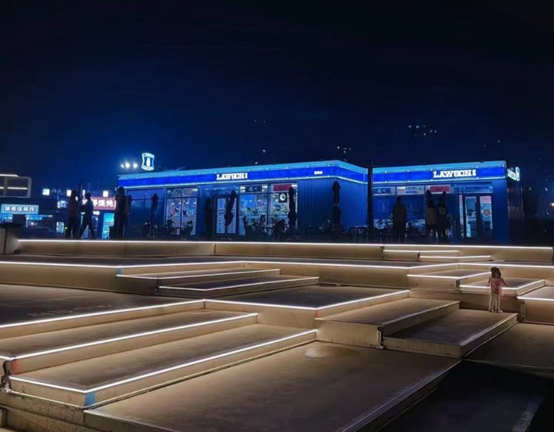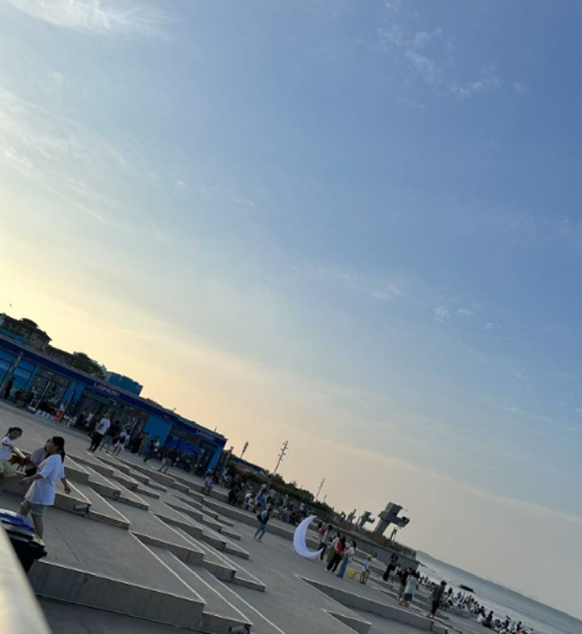 清晨、白天、夜晚,不同光线下,天空和店铺的明暗对比无论何时都十分迷人~店门口还贴心地设计了阶梯式休息区,逛累了可以坐会儿,吹吹海风超舒服!来天津玩的话,一定要来打卡哦