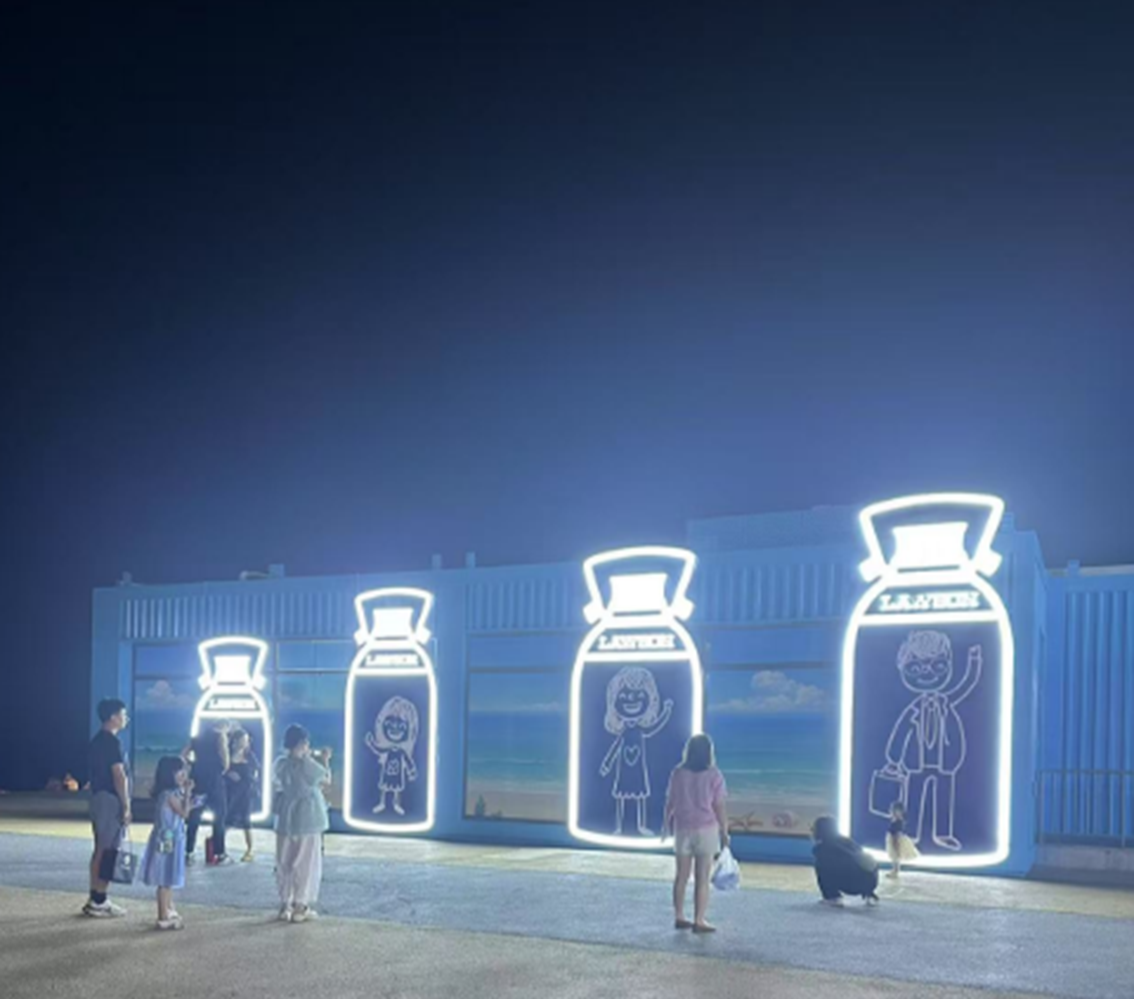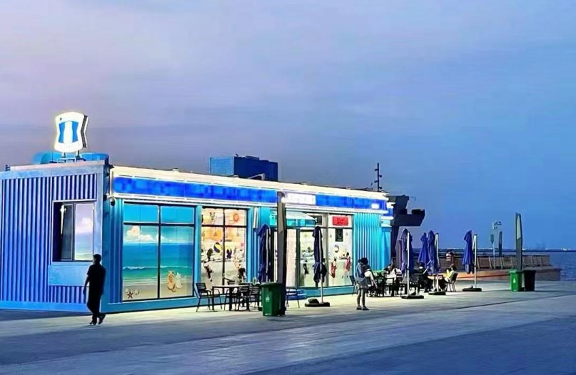 「天津东疆亲海公园店」位于天津海滨,风景极佳!这家店铺在中国的社交媒体小红书上也成为了热门话题。店铺背面画了四个超可爱的卡通人物,其实是店主一家人的q版形象!